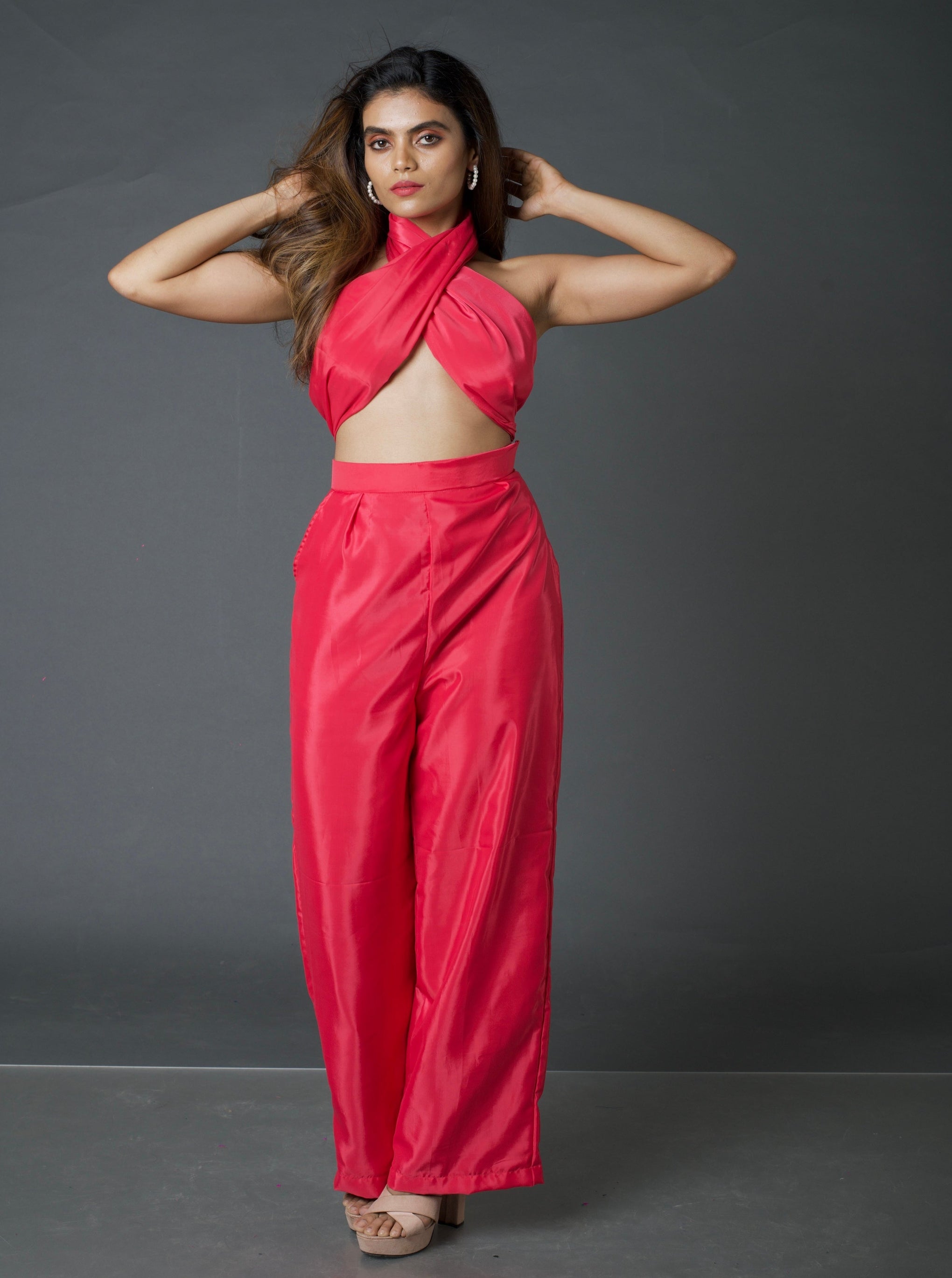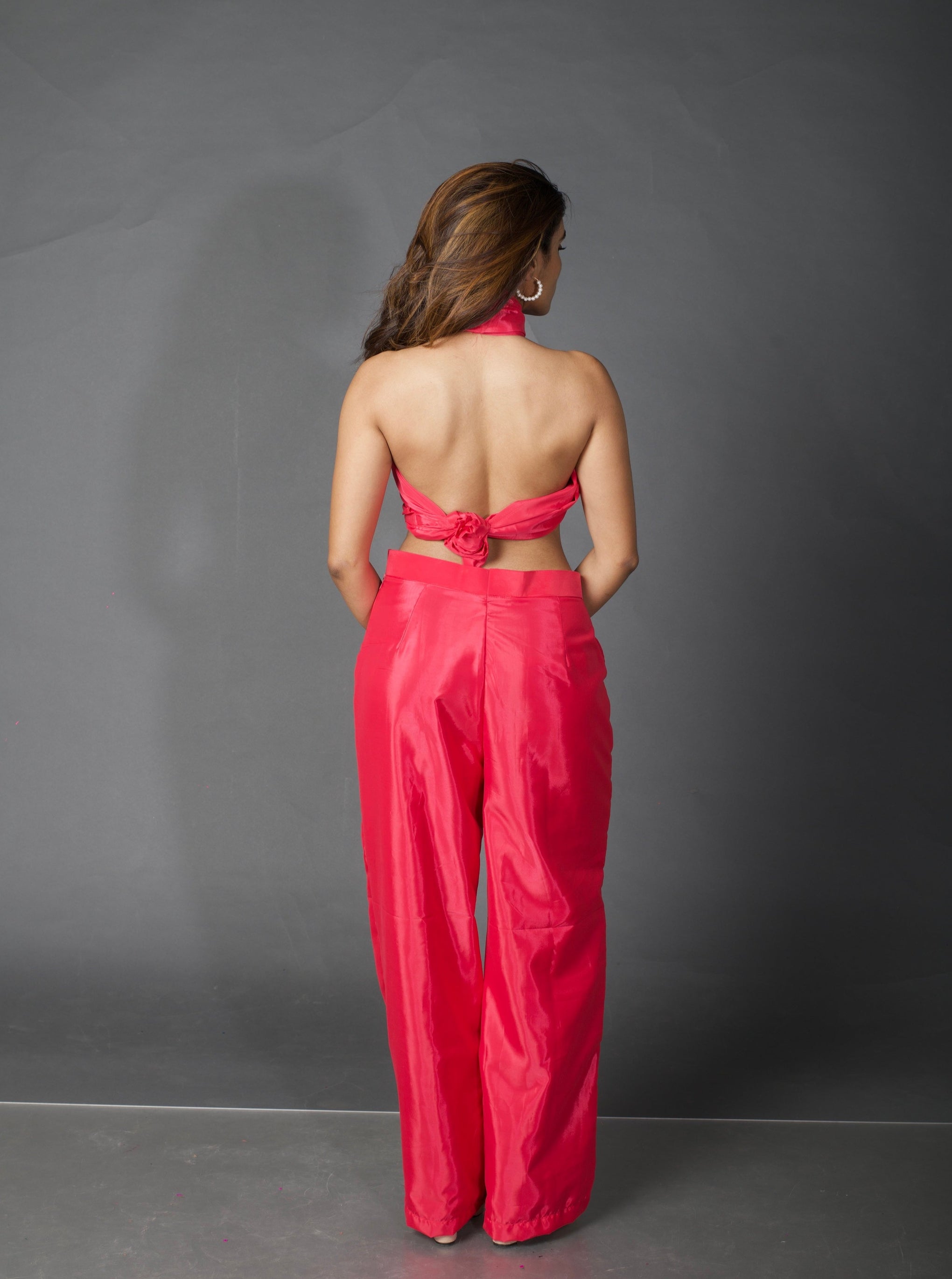 Say hi to this crisp and alluring convertible scarf top paired with straight pants, made in hot pink silk satin. Never get out of looks with this multi functional piece.