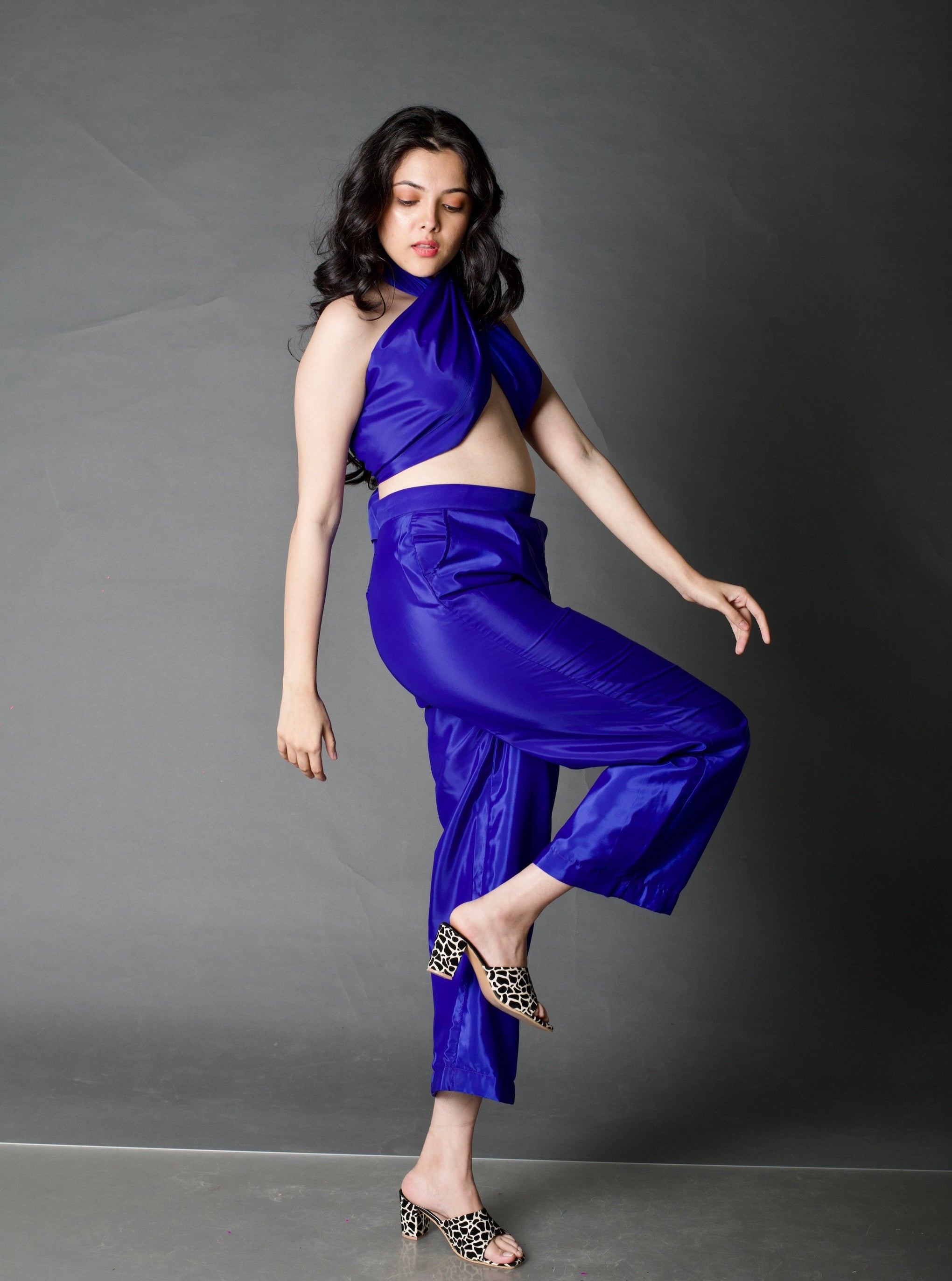 Say hi to this crisp and alluring convertible scarf top paired with straight pants, made in Royal Blue silk satin. Never get out of looks with this multi functional piece.