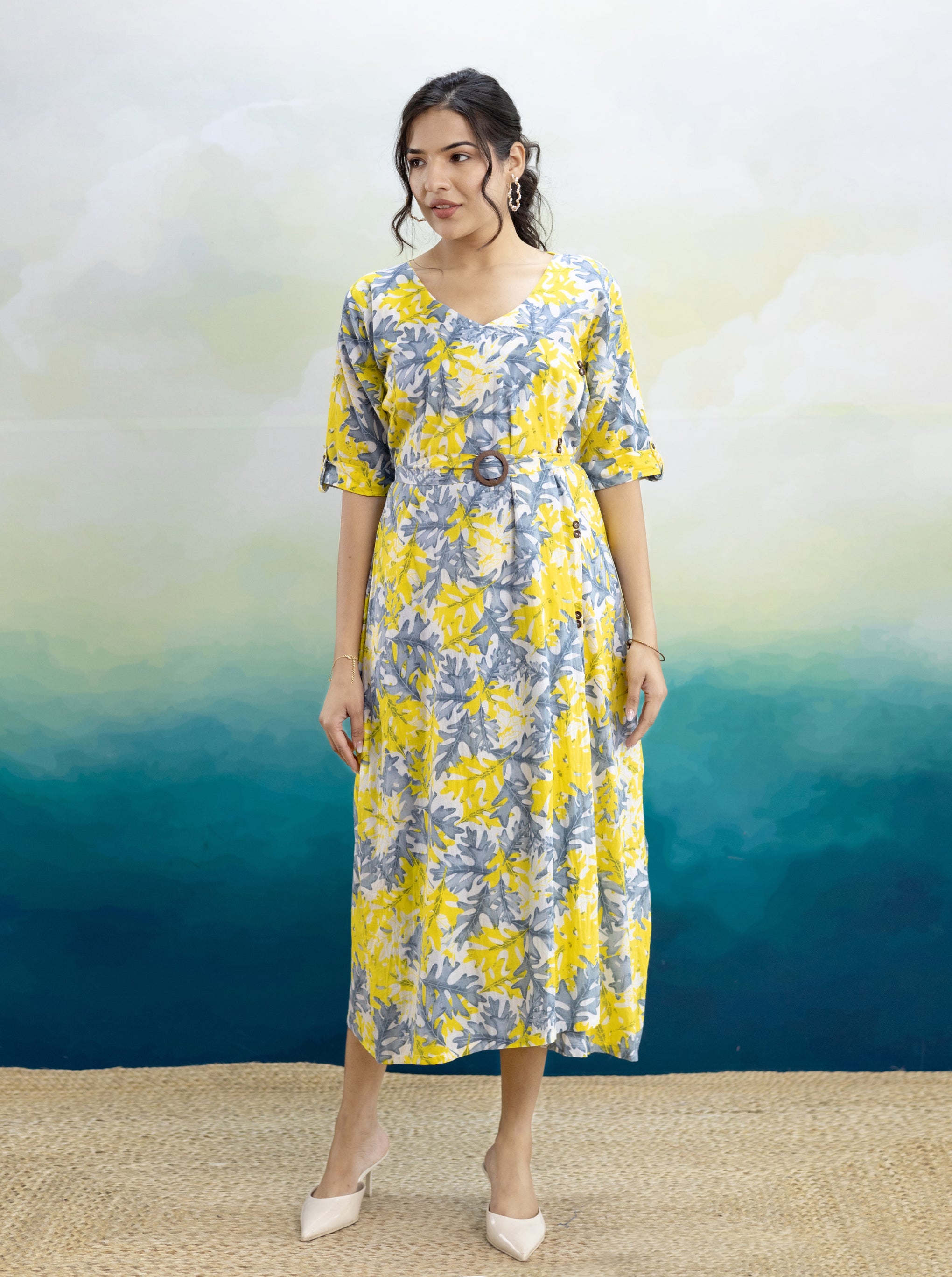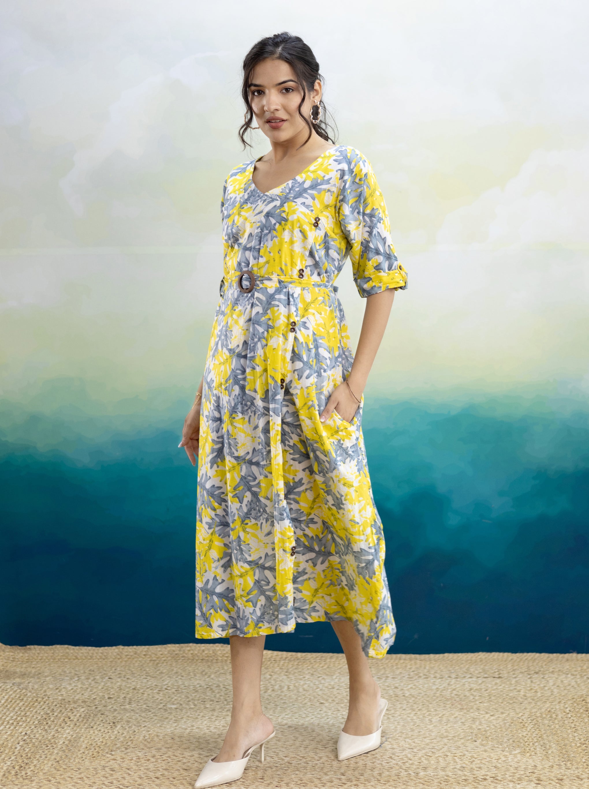 Embrace effortless style with our Printed Summer Midi, crafted for luxury and comfort. Featuring pockets, a chic belt, and the season's most coveted color, this dress is your perfect warm-weather companion. Sophisticated, breathable, and designed to impress.