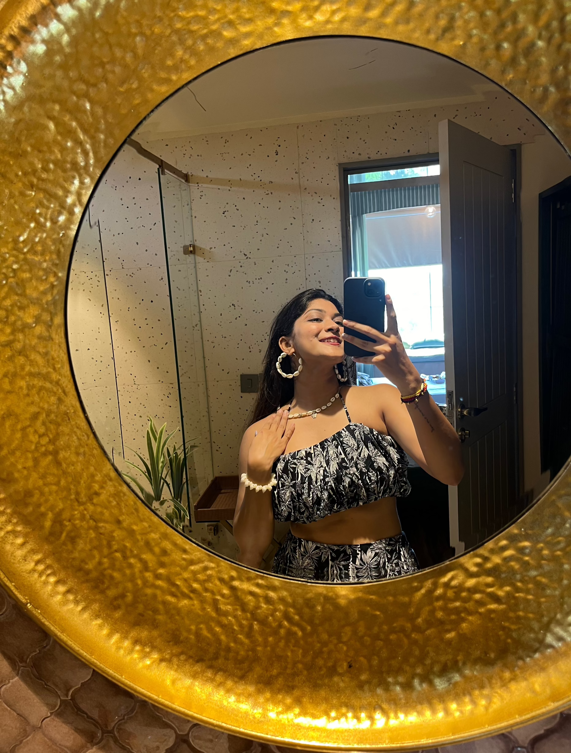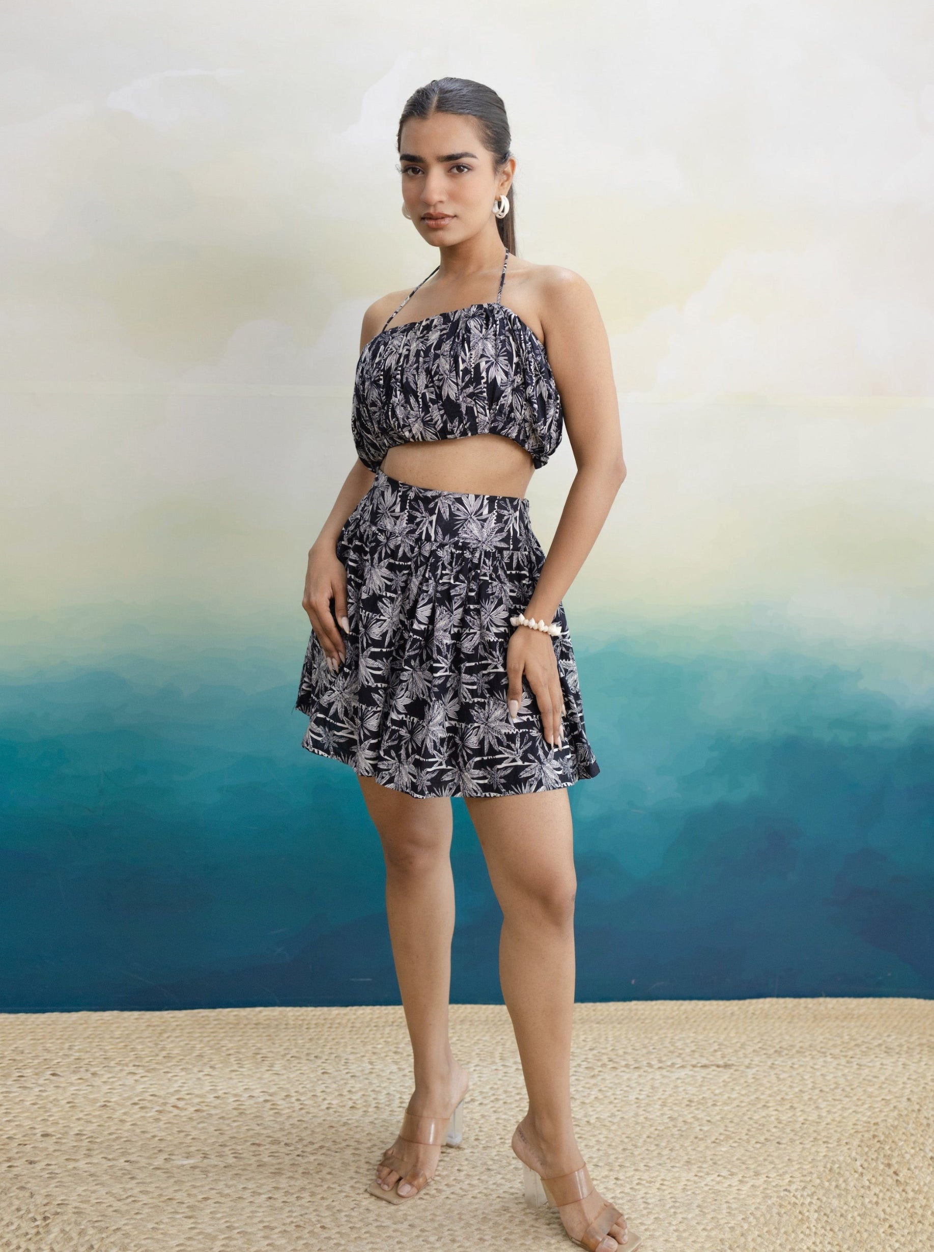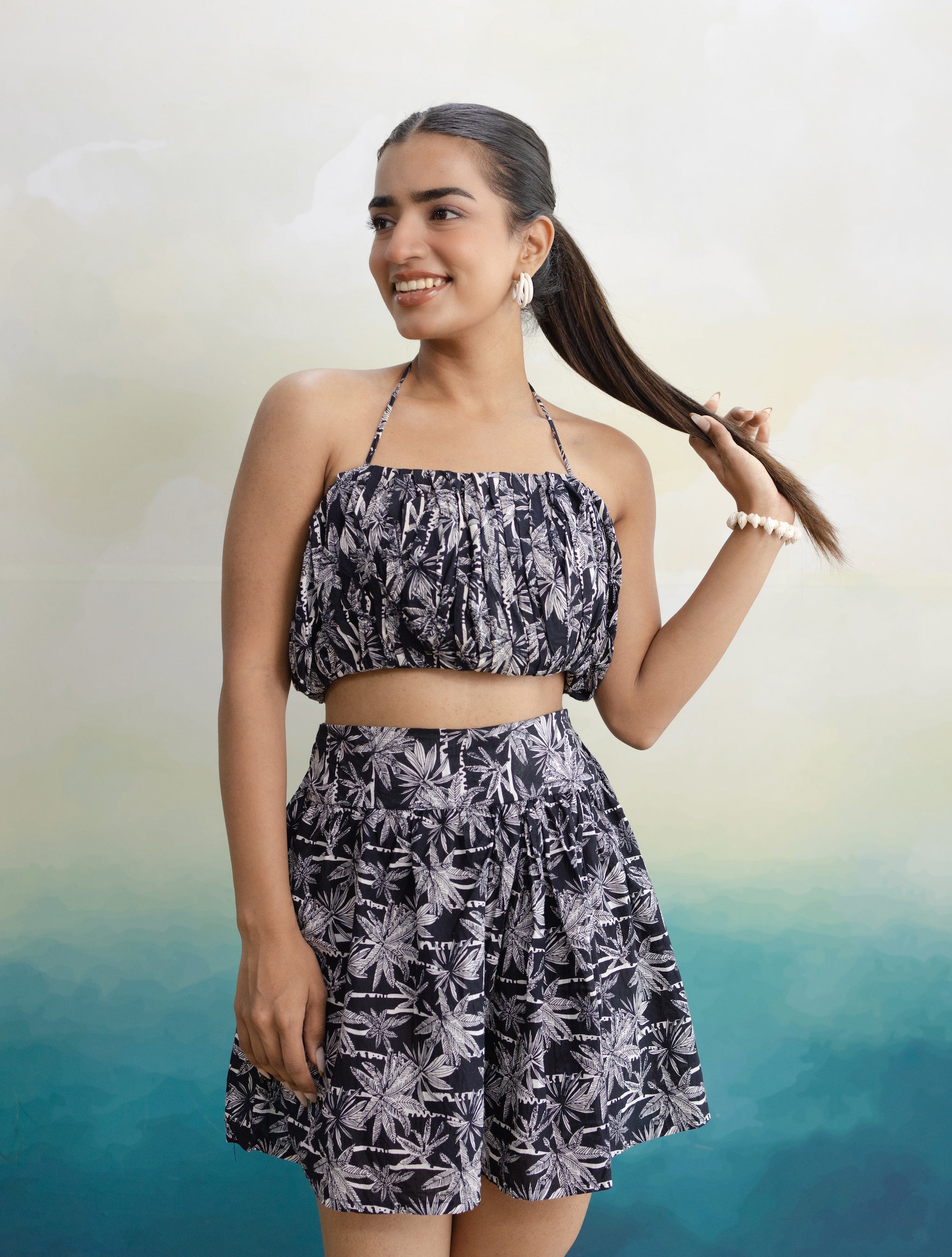This cotton print skirt set is a wardrobe essential! Featuring a flattering halter neck, pleated crop top with back smocking for comfort, and a mini gathered skirt to elevate your style. Effortlessly chic and easy to wear, it's perfect for your next getaway..
