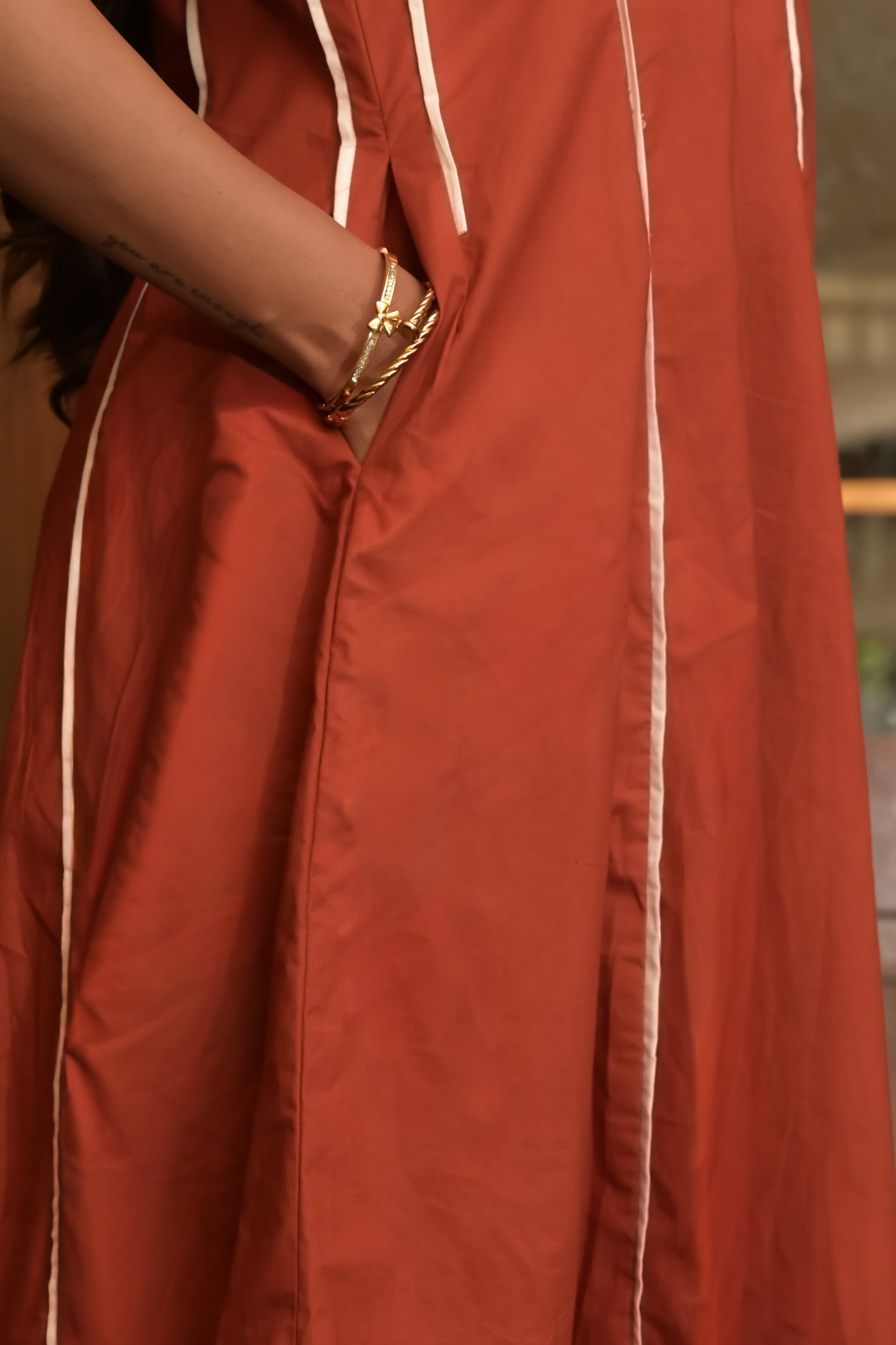 This Cotton cut-sleeve midi dress is detailed with crisp white piping for a touch of modern contrast. Designed with a clean A-line silhouette and practical side pockets, it blends quiet luxury with effortless wearability.